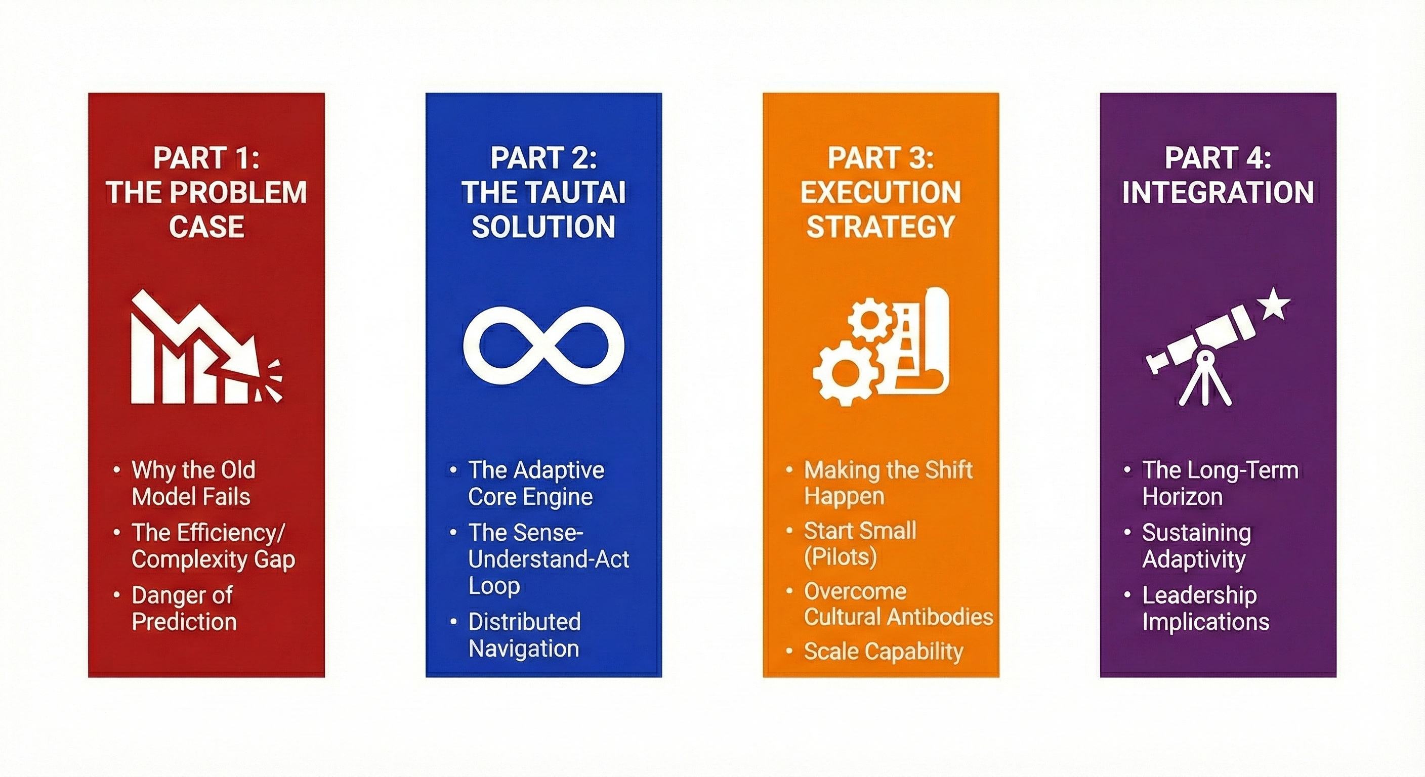 The Tautai Principle addresses a fundamental challenge facing organizations today: traditional predict-and-control management creates competitive disadvantage in volatile markets. While companies spend months perfecting strategic plans, adaptive competitors are already testing solutions and capturing opportunities.